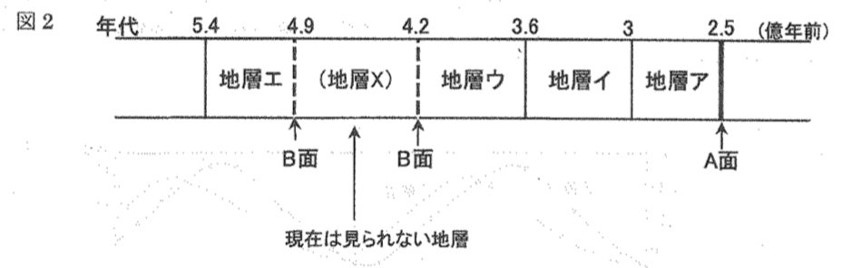 - ⑶図2は地層から堆積した年代を表しています。グランドキャニオンの地層は、地層エ→X→イ→アの順に堆積したのですが、4.9〜4.2億年前の間に堆積したはずの地層Xは現在は見られず、その両側の地層エとウが隣接し、その境界面がB面となっています。地層ウができるまでの様子を正しく説明したものはどれですか。下から選び、番号で答えなさい。ただし、この地域に断層は見られないものとします。