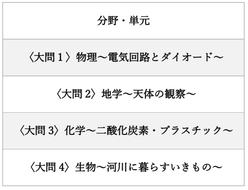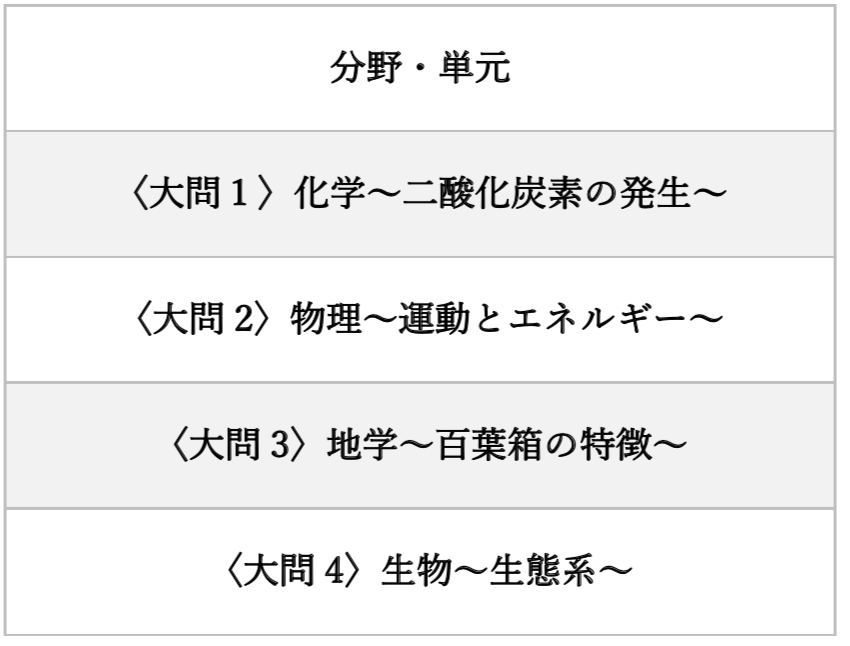 基本的には物理・化学・生物・地学の4分野からそれぞれ1問ずつ出題されており、一つの分野から複数題出題されることはほとんどありません。