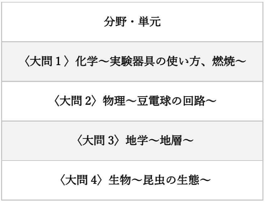 基本的には物理・化学・生物・地学の4分野からそれぞれ1問ずつ出題されており、同じ分野から複数題出題されるという場合はほとんどありません。