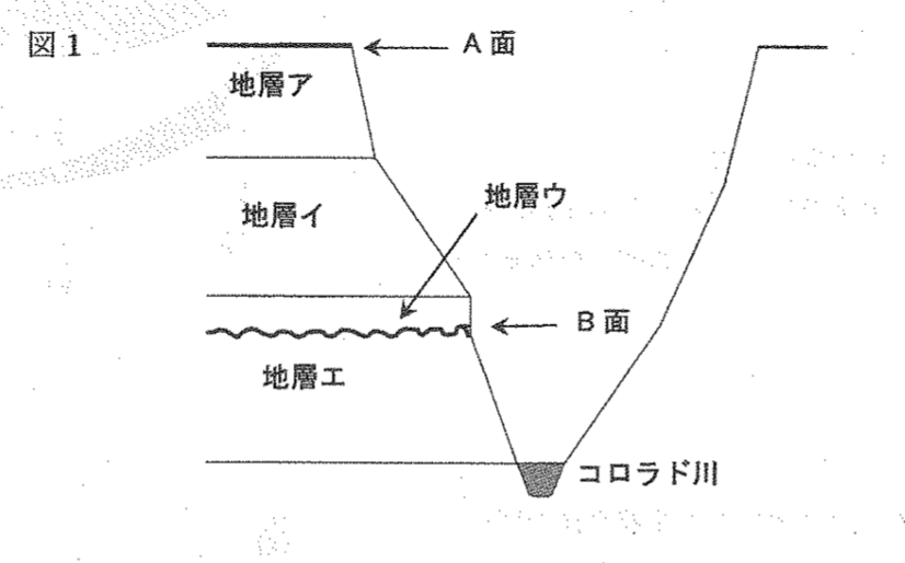 問題文中に、「その後、3000万年の間にコロラド川などの侵食作用によってグランドキャニオンの大峡谷はできました。現在、コロラド川は地表(A面)から1500m下を流れています。」という記述がある。