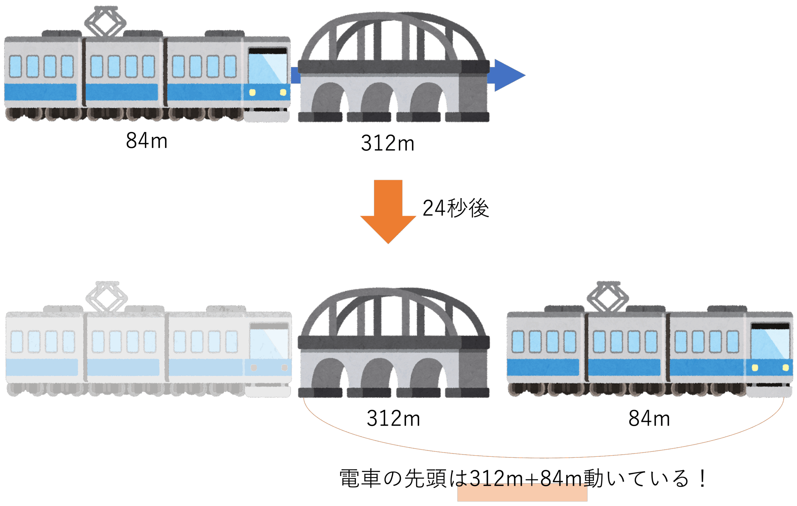 ここで引っかかりがちなのが,道のり=鉄橋の長さだと勘違いしてしまうことです。電車が鉄橋を渡ったと言われるとついそのように考えてしまいますが,渡り始め・渡り終わりの意味に注目すると何がいけないのかが見えてくるかと思われます。ここでの渡り始めとは電車の先頭が鉄橋に差し掛かったときであり,渡り終わりとは電車のお尻が鉄橋から出たときを指します。つまり渡り終わるまでに電車が走った距離は鉄橋の距離よりも長くなってしまうのです。それでは電車は一体どれくらいの距離を走ったのでしょうか。先程ご説明した「渡り始め・渡り終わり」の定義に基づくと,電車の走った距離は次のように図示できます。