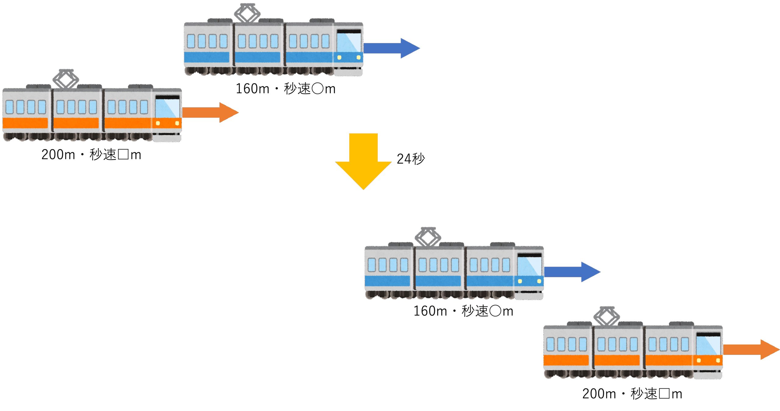 この図から分かることは,2つの列車は24秒をかけて距離を縮めて追い抜いていったということです。そして列車の走る速さが一定である以上,2つの列車の距離は一定のスピードで変化していくことになります。いま普通列車の速さが秒速○m・特急列車の走る速さが秒速□mと設定したので,ここでは1秒間につき距離が□-○[m]変化していくと判断できます。