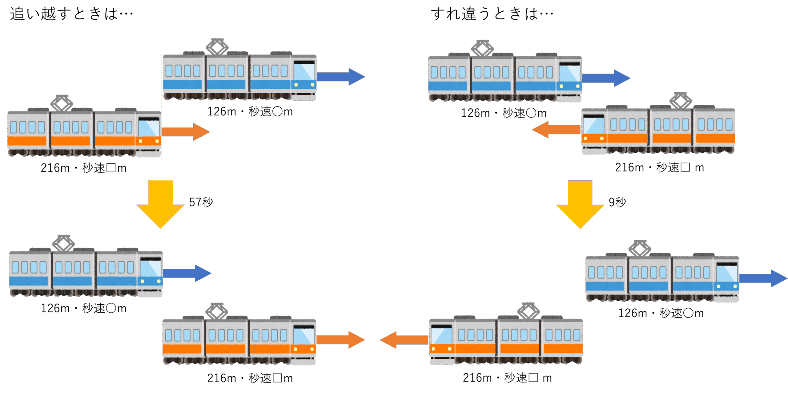 あとはこの図のそれぞれの場合について道のり・速さ・時間に関する式を立てていけば,□と○の関係を明らかにすることができ,答えに辿り着くことができそうです。まずは左側の追い越すときの場合ですが,こちらは先程解いた2問目の問題と同じように進めてみましょう。ここでの速さとは列車それ自体の速さではなく差異の変化の速さ,つまりはどれくらいのスピードで列車間の距離が変化するかということです。今回の問題では快速列車が秒速□m・普通列車が秒速○mだったので,追い越しが発生するとき2つの列車は1秒間に□-○[m]ずつ変化していくことになります。また次は道のりに関してですが,こちらも2問目で触れたように,快速列車が普通列車より普通列車の長さ+快速列車自身の長さ分,つまりは216[m]+126[m]=342[m]多く走れば指示通り追い越すことができますね。今回の問題ではズレ・差異がどれくらいの期間・距離・速さで発生するのかを確認していくことが大切なので,なかなか理解しがたいところもあるでしょうが,少しずつ慣れてきましょう。これらのこと及び文中で登場した時間をまとめると下のような計算式が出来上がります。