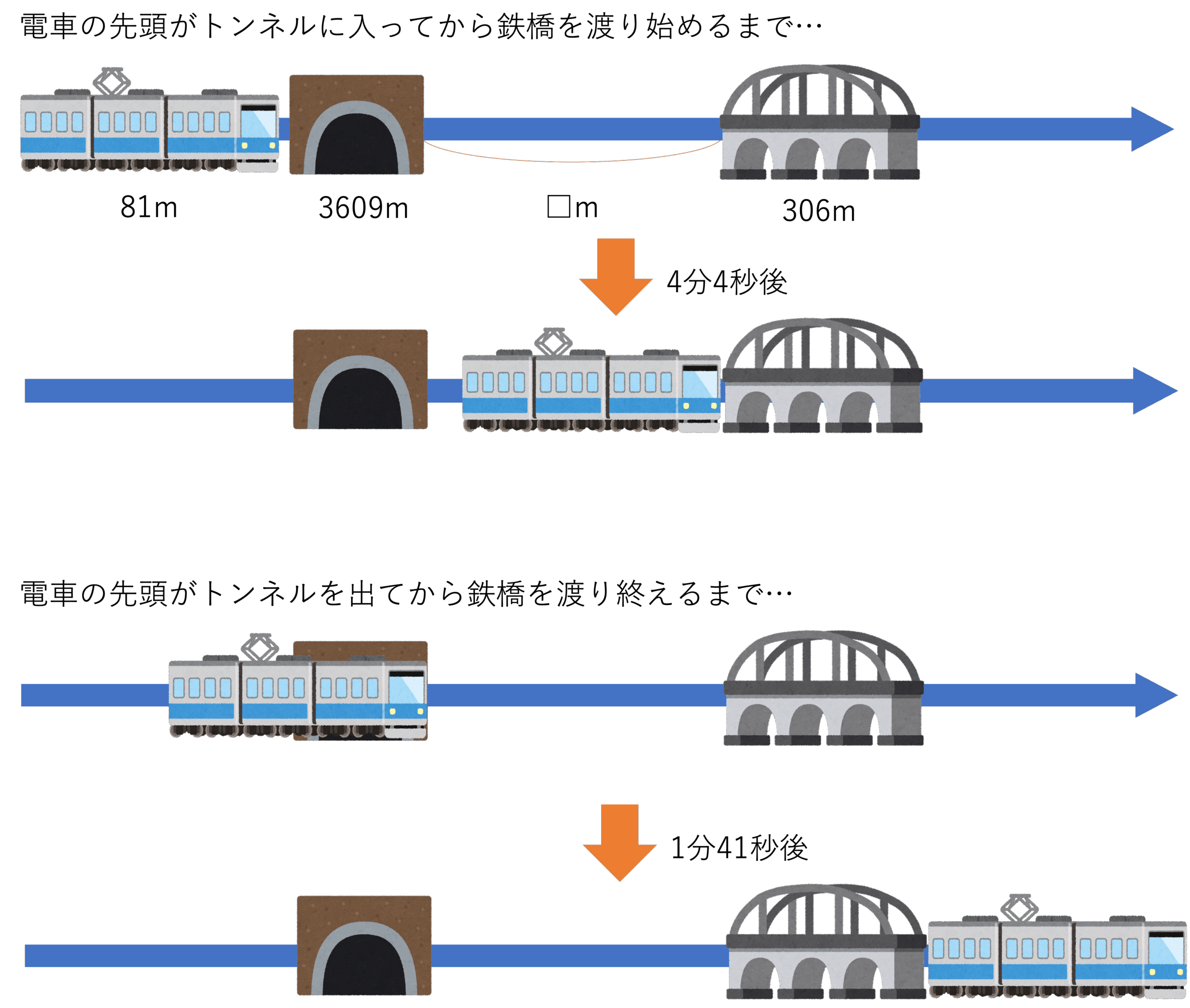 今回の問題でも上の場合から順番に考えていきましょう。まず先頭がトンネルに入ってから鉄橋を渡り始めるまでに関してですが,このとき電車が走った道のりはどれくらいでしょうか。電車はトンネル及びトンネルと鉄橋の間にある線路を通っているので3609+□[m]進んだことになります。このときかかった時間が4分40秒=280秒でした。