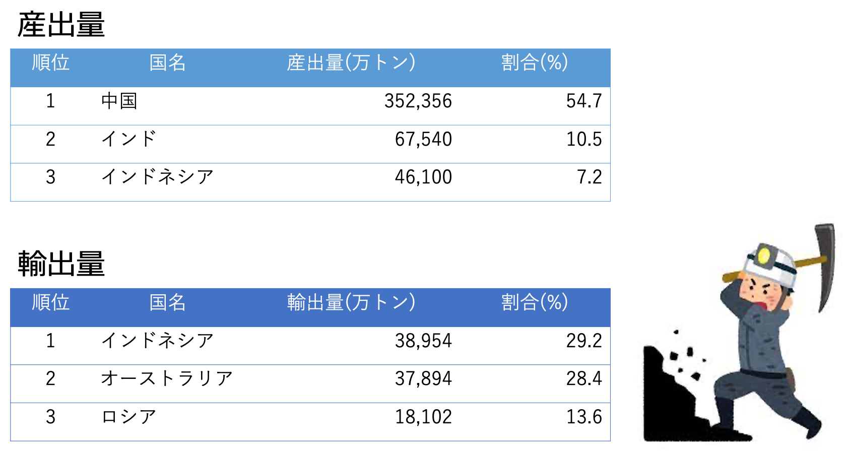 この表から産出量トップ3と輸出国トップ3がお分かりいただけると思います。この図から特に中国とインドに関して,たくさん産出しているのに輸出はそこまでしていないことが判断できます。これは採った石炭をそのまま自国内の工場などで使っているからです。