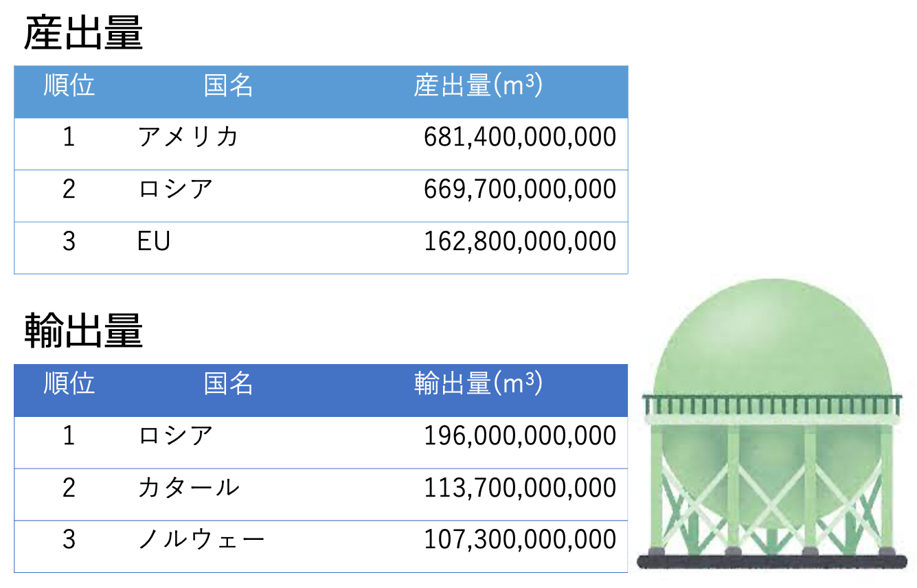 続いては天然ガスのランキングです。以前の記事では取り扱いませんでしたが,この天然ガスも化石燃料の一つです。ガスは気体なので体積で量を数えます。(データは世界の中の日本を知る世界ランキングからの引用です。(産出量・輸出量))