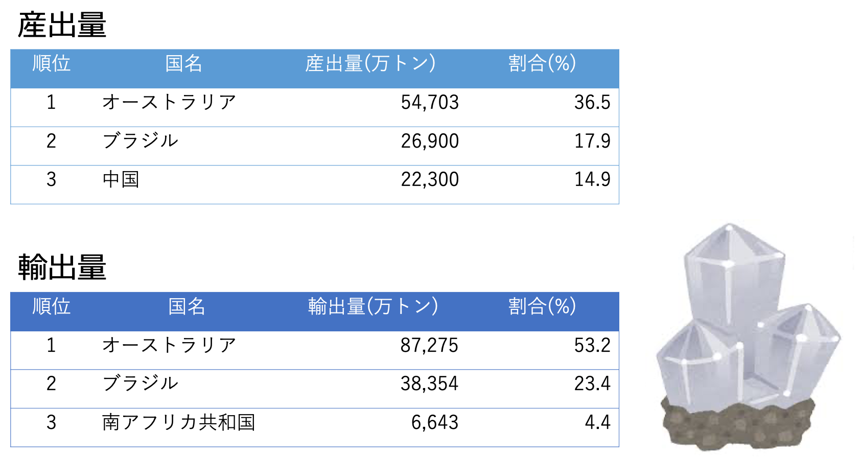 なお輸出量が生産量を超えている国がいくつかありますが,これはおそらく引用先のCNaviが引用しているデータが産出と輸出とで違うことによる誤差だと考えられます。どのランキングでもそうですが,量の細かい数値は特に覚える必要がありませんので,大雑把に国名だけ覚えていただければと思います。