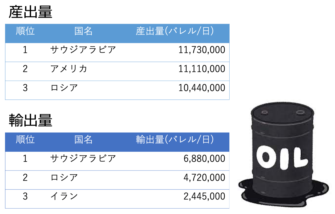 続いては石油のランキングを見ていきましょう。ここでバレルという機器馴染みのない単位が出てきていますが,これはヤードポンド法で使われる単位のことで,1バレルは大体160リットルのことを指します。またこのグラフは1日あたりの生産量なので,「1バレル/日」だと1日に160リットルの石油を掘り出していることになりますね。(データは世界の中の日本を知る世界ランキングからの引用です。(産出量・輸出量))