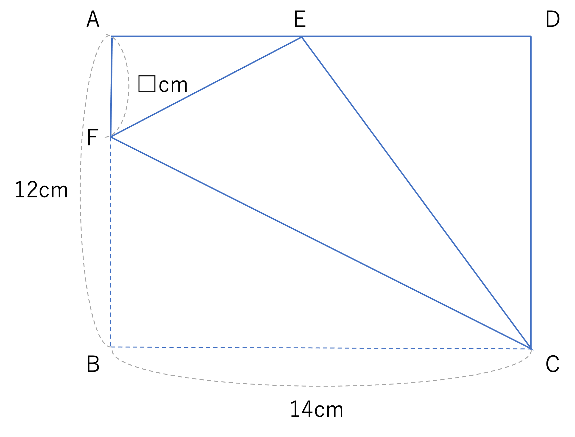 長方形ABCDの頂点Bが辺AD上にくるように折り返します。頂点Bが移る点がEで,Eは辺AB上にあり,CFが折り目であるとき,AFの長さを求めなさい。
