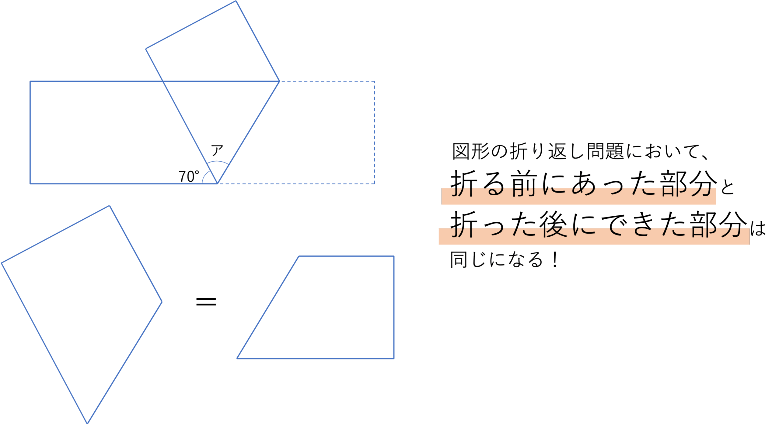 - 図形の折り返し問題は折る前に存在していた部分の図形と折った後に新しく生まれた部分の図形は同じ形になる!