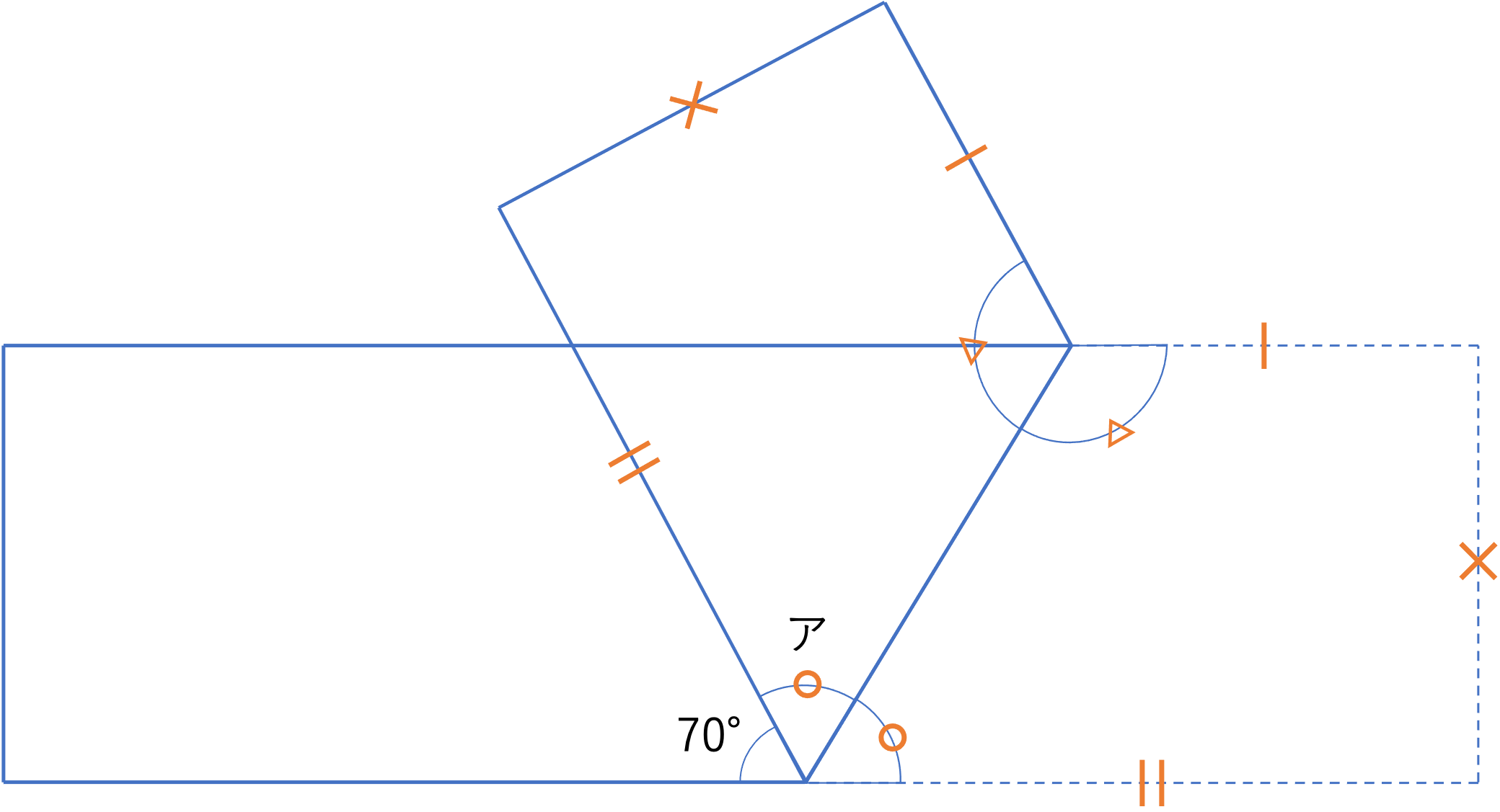 以上のように対応関係を図に落とし込んでいくことで,様々な情報が目で見て分かりやすくなります。簡単な問題でも書き込んでおく癖をつけておきましょう。今回の問題だとアの角と同じ大きさをする角が折れ線を挟んで反対側にも存在することが分かります。問題を解く上で重要な手がかりになりそうですね。