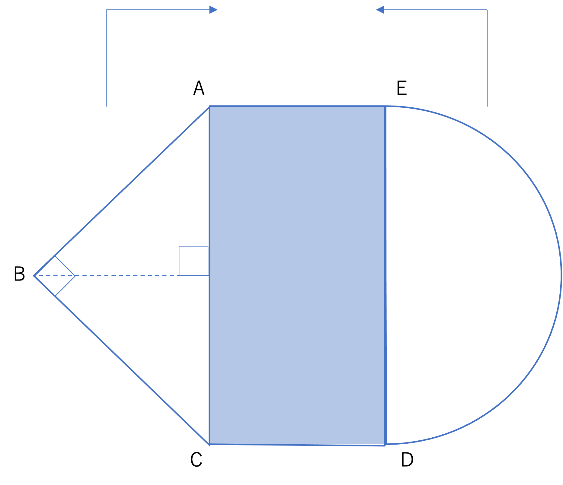 このように操作を図に起こすことで,あんなに長かった文章題がちょっとだけスッキリしますで。要するに,5行も6行もあった文章は上の青い部分の面積を求めなさいという内容にまとめられます。この点で「見える化」の意味を理解していただけますと幸いです。さて,ではここからは青い部分の面積を求めていきましょう。この部分は上と下の2つに分かれています。その片方を見ていき,面積を求めた後に2倍すれば答えとなる2つの部分の合計まで計算できそうです。これが計算のロスをなくすということですね。さてこのとき上の部分に注目しますと,長方形を真ん中の線で半分にした四角形を,これまた対角線で半分にした三角形から扇型を引いた形に見えますね。そのためここからは三角形と扇型の面積について考えてみます。