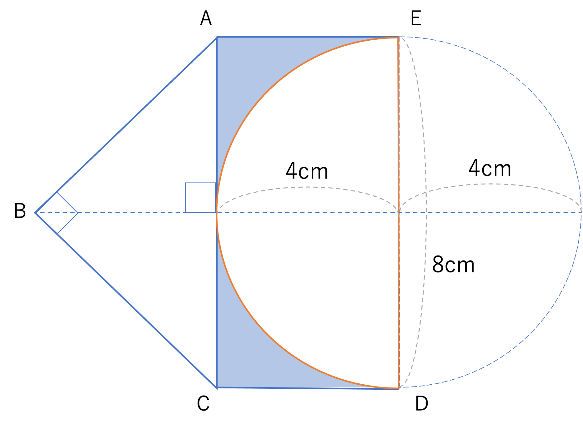図のように,直角二等辺三角形ABC,長方形ACDEと,DEを直径とする半円が組み合わされた図形があります。ACの長さは8cm,CDの長さは4cmで,長方形ACDEはぬりつぶされています。いま,半円をDEを折り目にして,長方形の上に重なるように内側に折り返します。さらに,直角二等辺三角形ABCをACを折り目にして,折り返した半円の上に重なるように内側に折り返します。このとき,ぬりつぶされた部分のうち,見えている部分の面積を求めなさい。ただし,円周率は3.14とします。