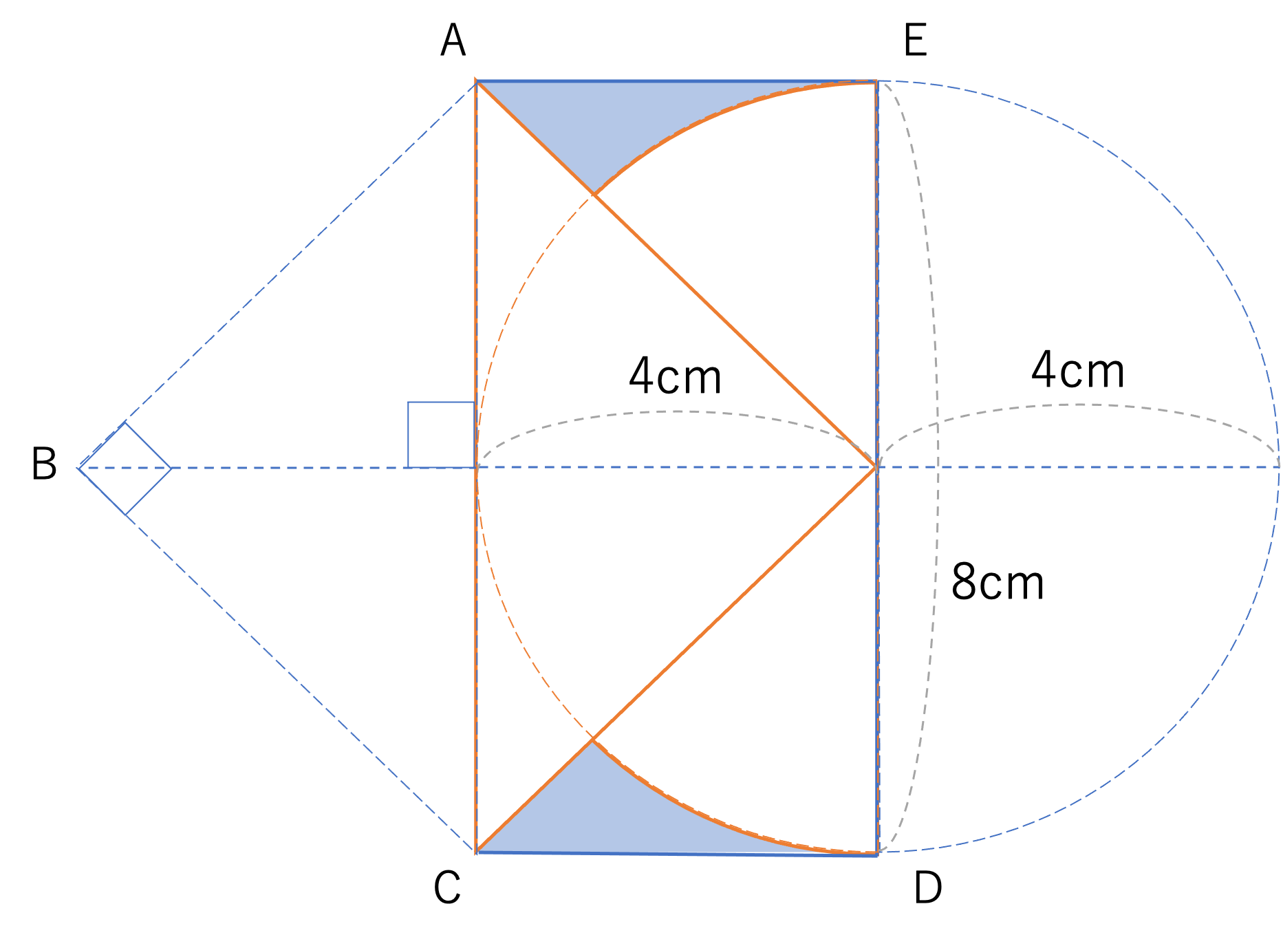ここからは1問目の解説に移ります。前述したように問題文が長いだけあって,なかなか理解するだけでも時間がかかってしまいそうですね。ただ計算過程で簡単にできる部分はあっても,情報の整理は一切スキップできませんので,着実にシチュエーションをまとめていきましょう。まずこの問題の図形ですが,これは折り返される前のものですが,これだと求める部分の面積が見えにくいですよね。そのため折り返す前の図形が登場する場合,自分で図を描きながら面積を「見える化」していきましょう。この問題ではまず半円の部分を折り返すといわれています。ここでDEは長方形の反対側にある辺であるACと等しく,DEは半円の直径になっているので,半円の直径は8cm・半径は4cmであると分かります。そして長方形の横の長さも4cmであることから,半円を折り返したら端が長方形の端と重なると判断できますね。このことからまず図形は次のように変形すると分かります。