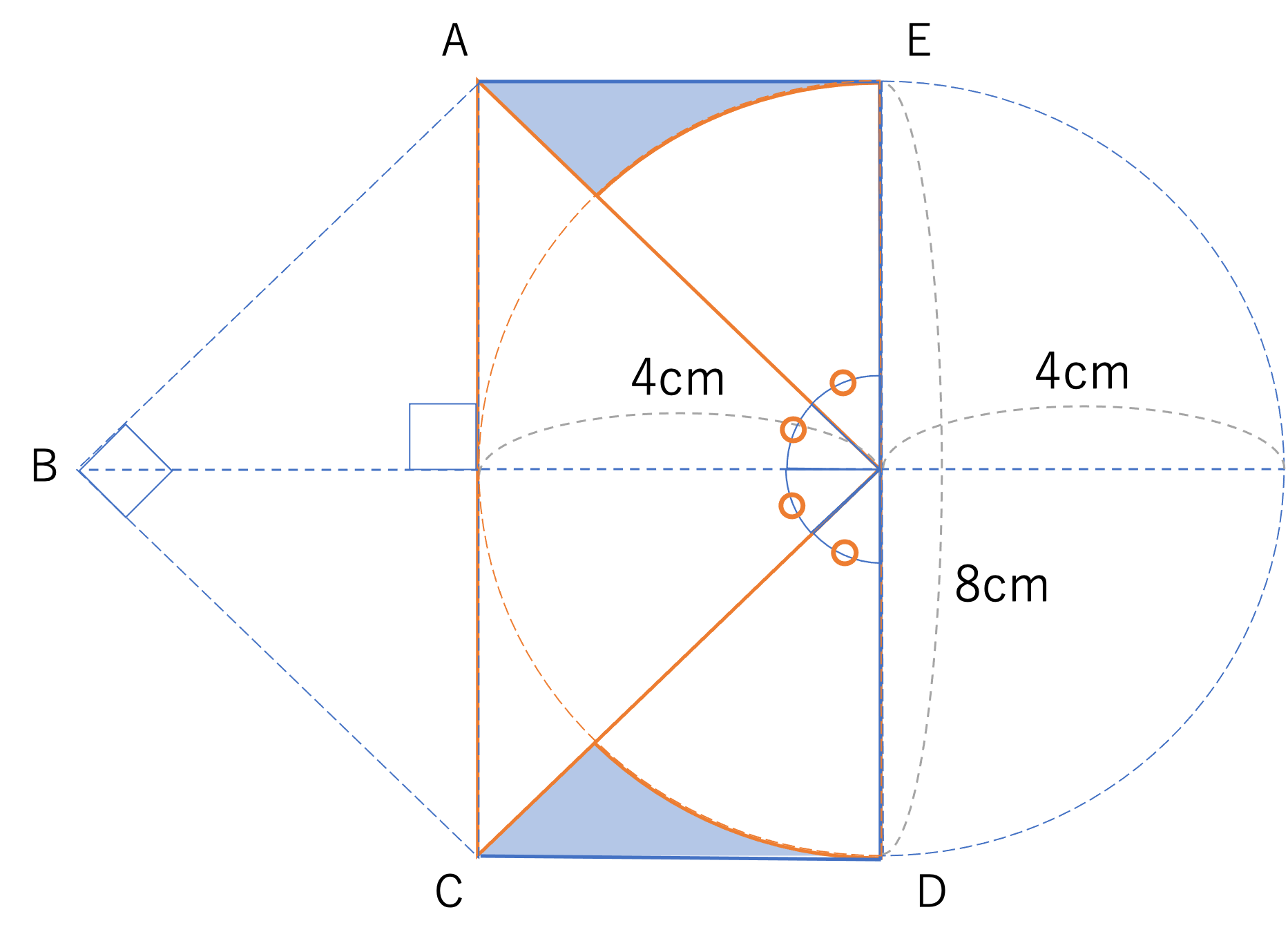 まず三角形ですが,この図形はAEを底辺・Eから円の中心に向かって伸びる線分,つまり半径を高さとしている,とみなせます。いまAEの長さも半径の長さも4cmであるので,この図形は二等辺三角形であり,面積は4×4÷2=8cm2だと分かります。次に扇型ですが,いま青い部分にまつわる三角形が二等辺三角形であること,およびABCを折り返した図形が二等辺三角形であり半円の半径がその頂角を半分にしていることから,次のような対応関係が確認できます。