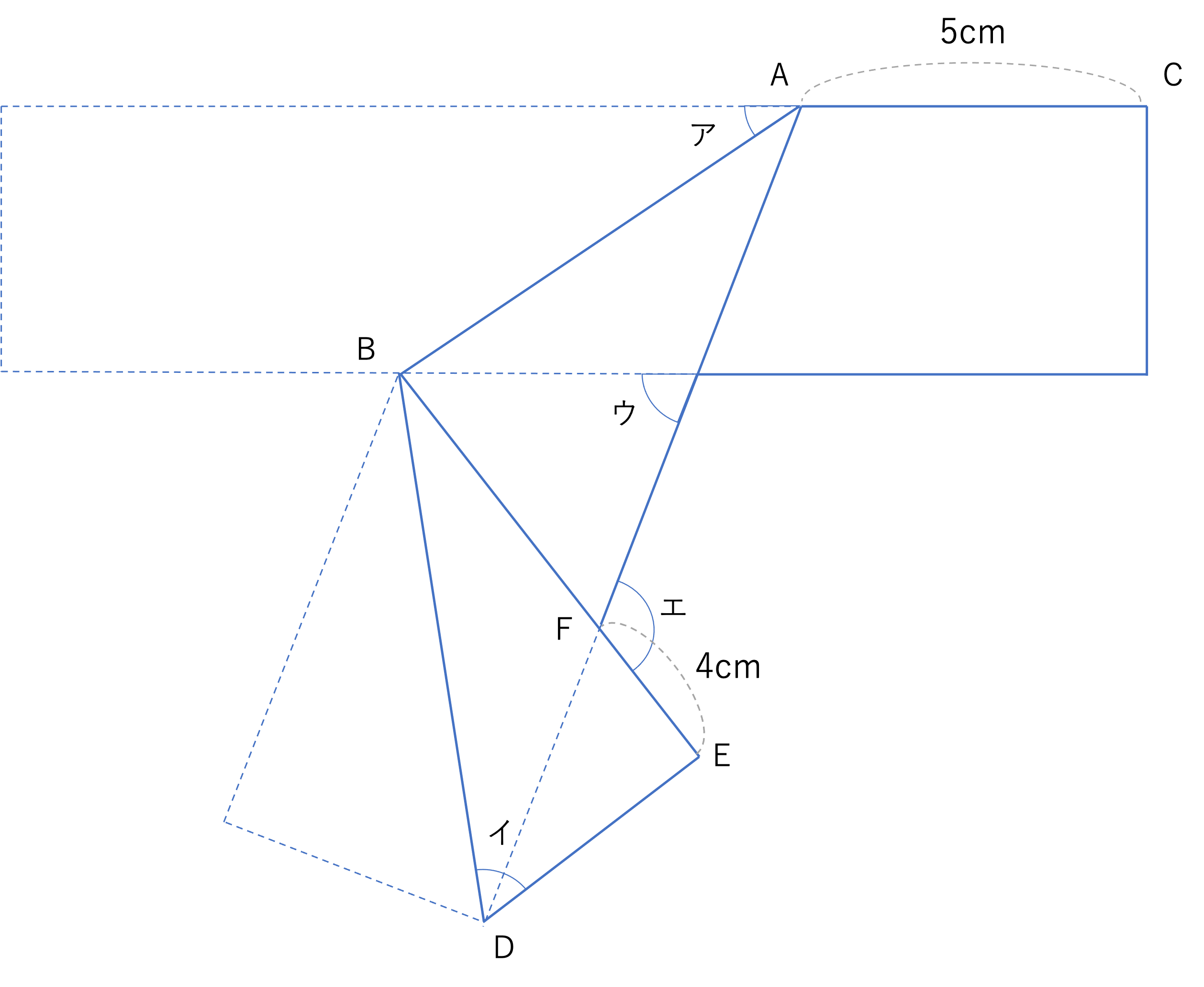 下の図のように,長方形の紙をABを折り目として折り返したあと,BDを折り目として折り返しました。角アは30°,角イは60°,AC=5cm,EF=4cmであるとき,角ウ,エの大きさを求めなさい。