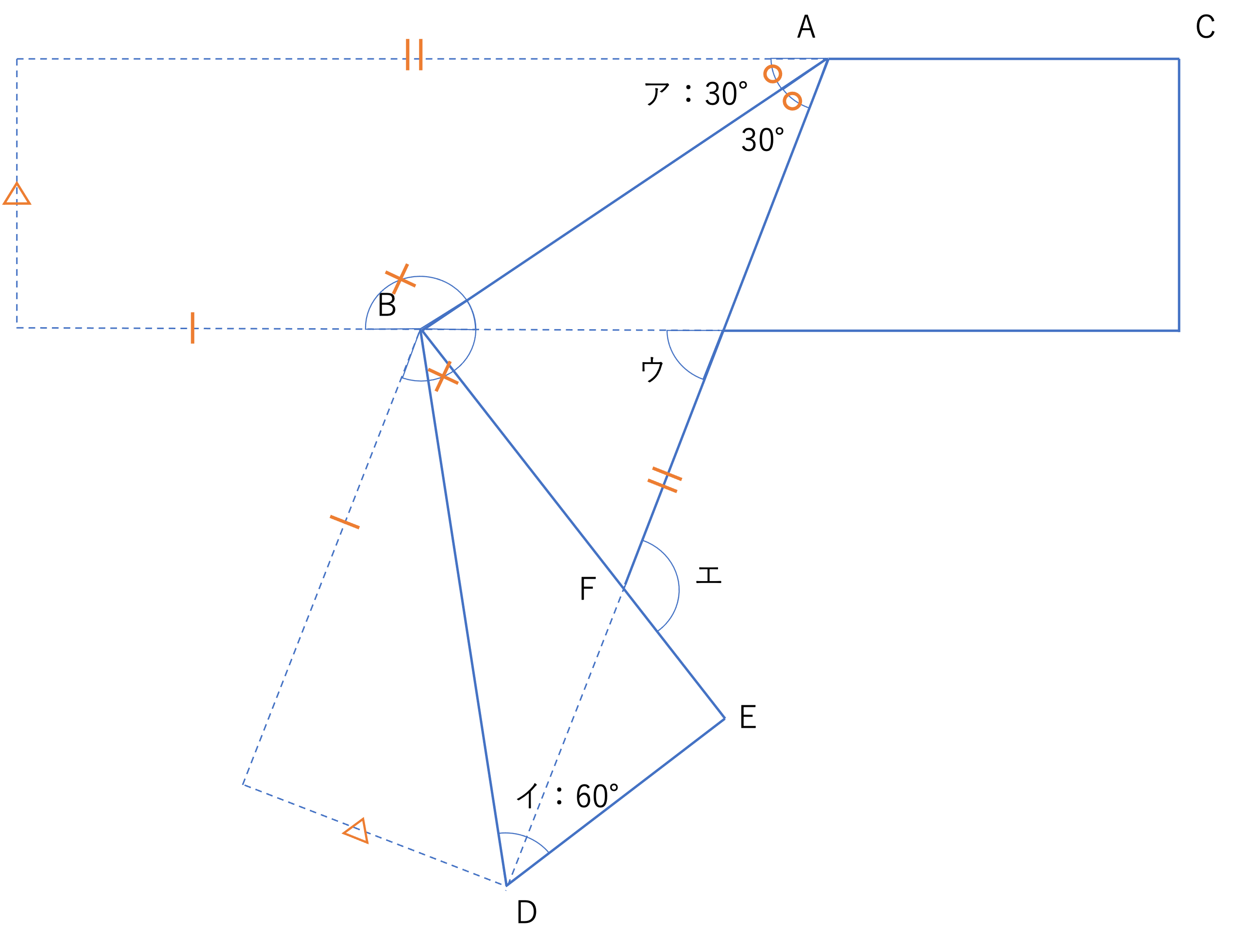 この部分は×で示した角の反対側にあります。そして×の角度は四角形の内角の和の関係から360°-(90°+90°+30°)=150°となりますので,オレンジの部分は30°と分かり,青で示した図形は二等辺三角形だと分かります。このことから二等辺三角形の頂角の外角であるウの大きさは,30°+30°=60°となります。