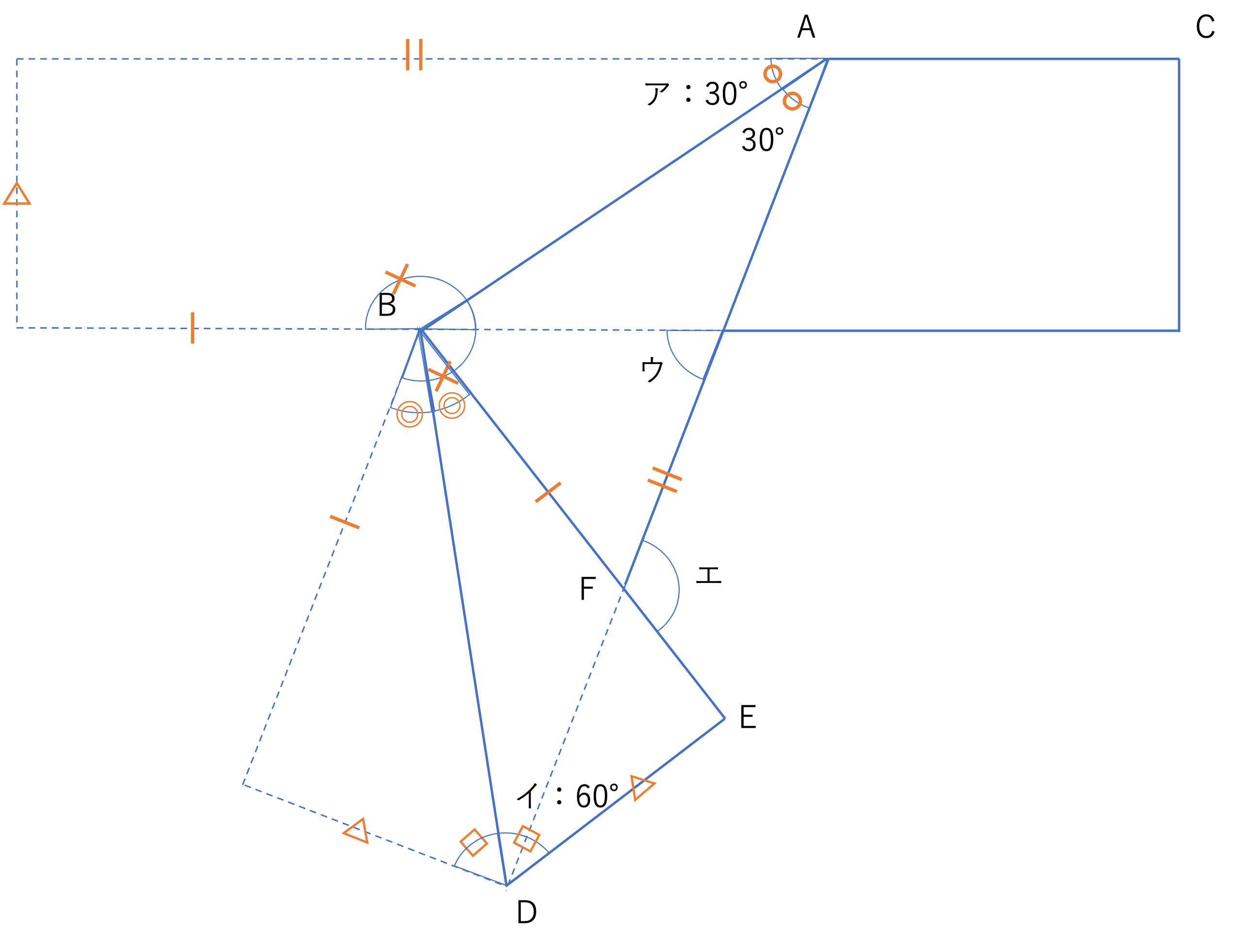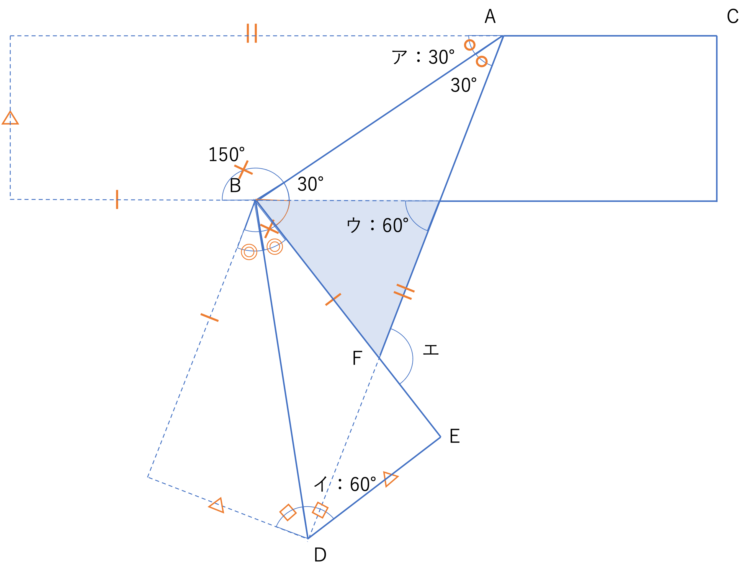 このオレンジで示した角度は×を折り返した角度から◎の角度2つと30°を除いたものとみなせますね。いま×の大きさは150°だと求まっているので◎の大きさを考えていくと,この部分は三角形BDEの内角の1つであり,角BDEが60°・角BEDが90°であることから180°-(60°+90°)=30°だと分かります。それゆえこの部分の大きさは150°-(30°×2+30°)=60°となりますね。よってオレンジでマークした角度とウの角度を足したエの値は60°+60°=120°となります。今回は対応関係だけでなく内角・外角の性質なども使用したので,もし忘れてしまった方は振り返っておくといいでしょう。