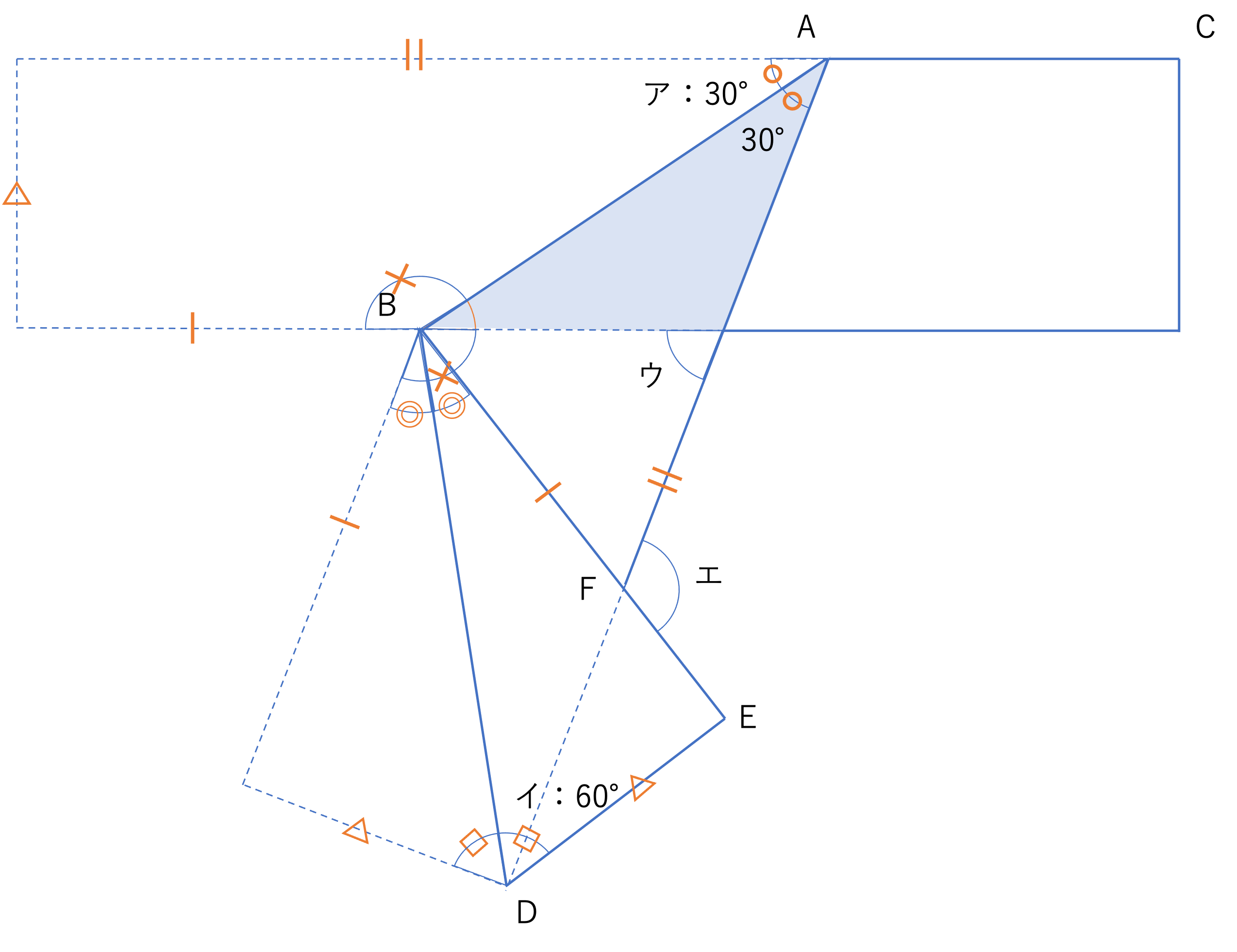 さてここまでが問題文から分かることです。あとはこれらの対応関係をもとにそれぞれの角度を計算していきましょう。この手の問題はアイウエオ順やアルファベット順で答えが求まるようになっているのが一般的ですので,まずはウから見ていきます。この部分はいろいろな見方ができますが,そのうちの一つとして,ウはアを折り返した○で示された角度を含む三角形の外角だとみなせますね。そのため30°・ウの反対側の角以外の角度である,オレンジでマークした角度の大きさが分かれば答えが求められそうです。