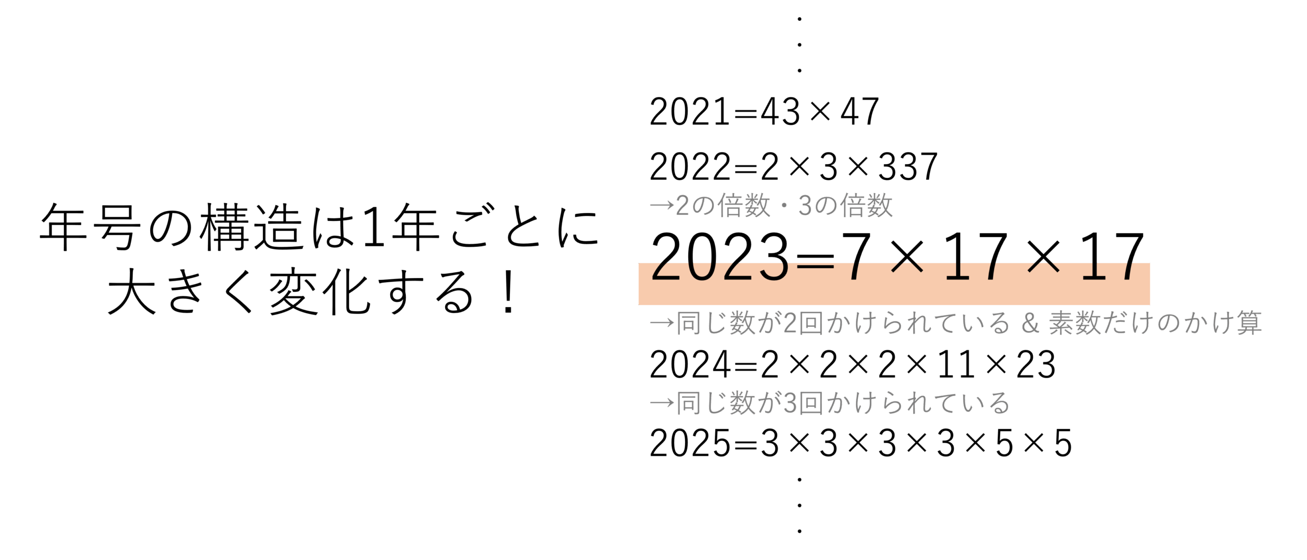 最後になりますが,年号というのは受験に登場させるのにうってつけの数となっています。それは1年変わるごとに数字の構造が大きく変わるからです。前述したように2022=2×3×337,2023=7×17×17とこの時点でも大きく異なるのに,2024は2×2×2×11×23,2025は3×3×3×3×5×5と中身がガラっと変化します。また計算式などの場合,適当に作成した問題だとこの世のテキストのどこかに同じ問題が存在する可能性がありますが,年号を使ったものはそうそう被ることはなく,公平性を保つという点でも使用されることがあります。したがって受験を少し楽にする手段として,年号というものに注意を向けておくとお得になることがあるかもしれません。