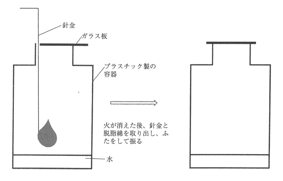 - 問3 アルコールを加熱して得られた液体の性質を調べるために、得られた液体を脱脂綿に吸わせ針金の先につけて点火し、下図のように、空気と水の入ったやわらかいプラスチック製の容器に入れ、ガラス板でふたをしました。しばらくすると火が消えたので針金と脱脂綿をとりだし、容器の口をガラス板ですばやく完全にふさいでよく振りました。