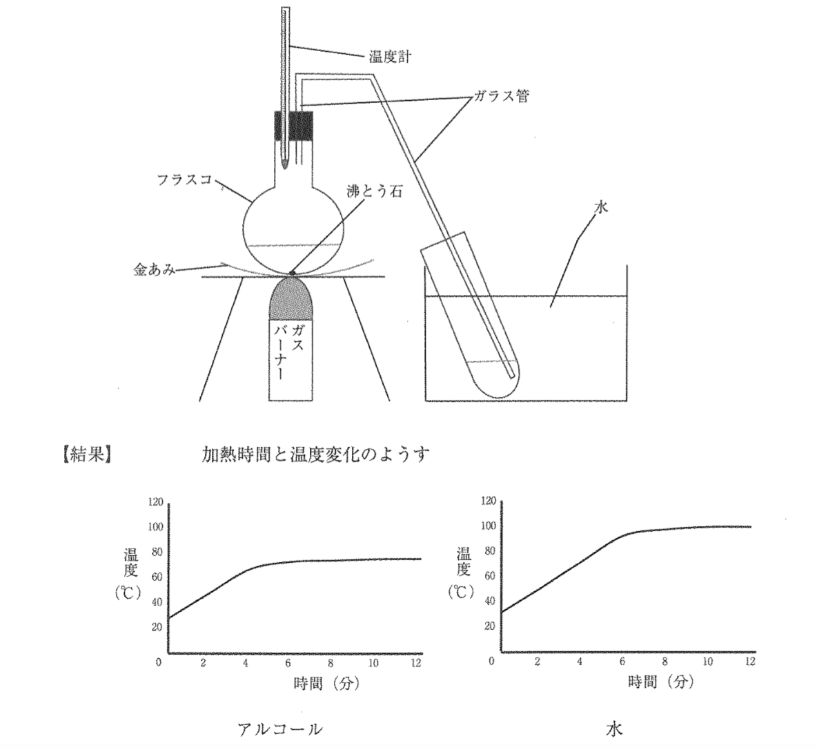 水、アルコールの2種類の液体を用意し、それぞれ別々のフラスコに50㎤ずつ入れた。図のように温度計とガラス管を取り付けたゴム栓でフラスコにふたをし、ガスバーナーで加熱した。加熱され出てきた蒸気は水で冷やし試験管に集めた。