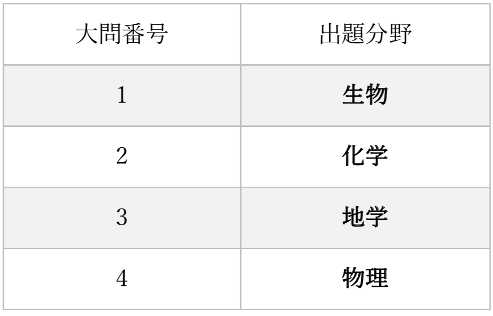 基本的には第1問が生物、第2問が化学、第3問が地学、第4問が物理からの出題となっています。