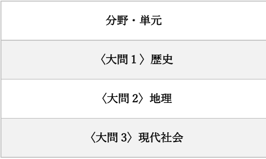 基本的には地理・歴史・現代社会(公民・時事含む)の3分野からそれぞれ1問ずつ出題されることがほとんどです。複数分野を組み合わせた融合問題のようなものは出題されていません。