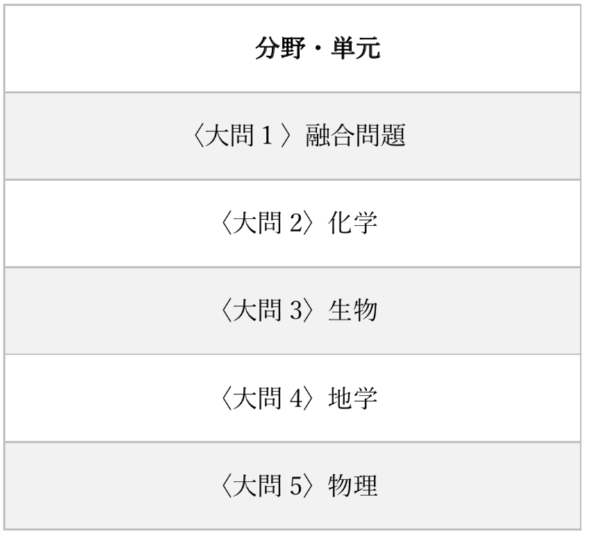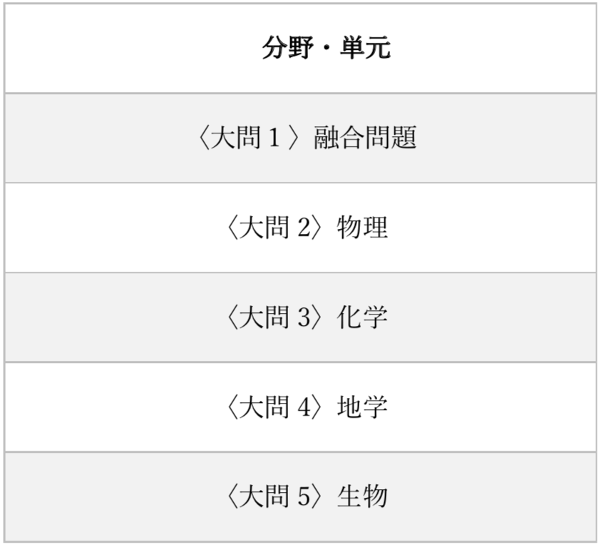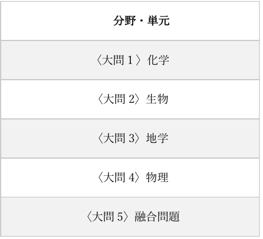 基本的には物理・化学・生物・地学の4分野からそれぞれ1問ずつと、4分野すべての融合問題が1問出題されています。