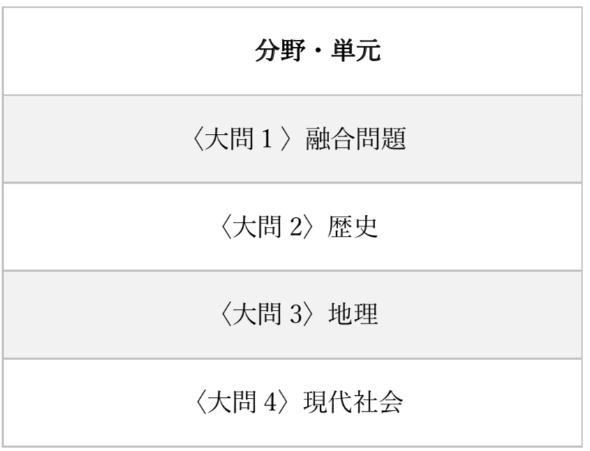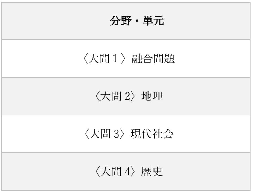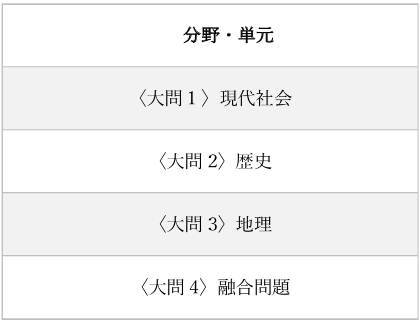基本的には地理・歴史・現代社会(公民、時事含む)の3分野からそれぞれ1問ずつと、3分野の融合問題が1問出題されています。