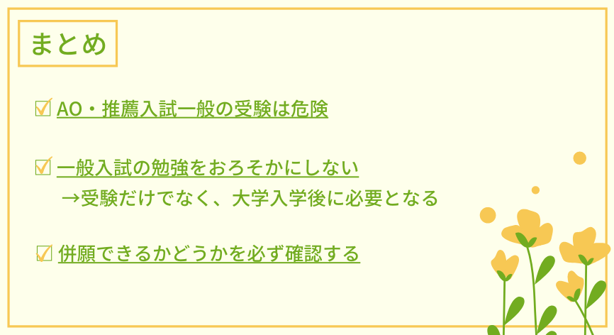 AO・推薦入試で合格した後に、一般入試で別の大学を受けてそちらに入学することもできないので注意が必要です。