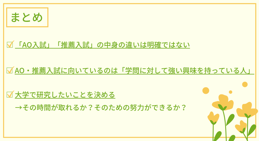 AO・推薦入試は大学とのマッチングを見られる入試です。ですので、大学にそこまで行きたいわけではない人や、学ぶことが好きではない人は決定的にAO・推薦入試に向いていません。