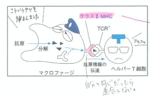 非自己の断片の入ったMHC抗原とは結合し、非自己だと認識する。