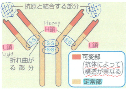 すべての抗体で共通のアミノ酸配列をもつ定常部と抗体によってアミノ酸配列の異なる可変部からなり、可変部は多様な抗原と特異的(1つの抗原に1つの抗体)に結合する。これを抗原抗体反応という。