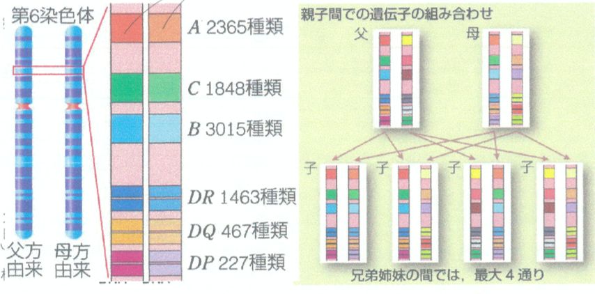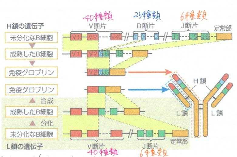 - H鎖遺伝子の組み合わせ…V遺伝子40種類×D遺伝子25種類×J遺伝子6種類=6000通り