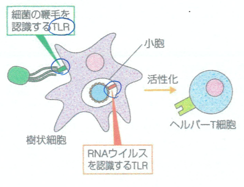 自然免疫によって樹状細胞が異物を取り込む際、樹状細胞の表面にあるTLR(トル様受容体)というタンパク質が異物だと認識する。