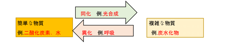 外界から取り入れた簡単な物質をもとに、体物質や生活に必要な物質を合成する過程。