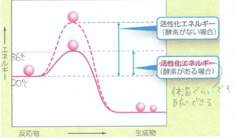 - 生体触媒…生物の体内ではたらく酵素。タンパク質でできている。