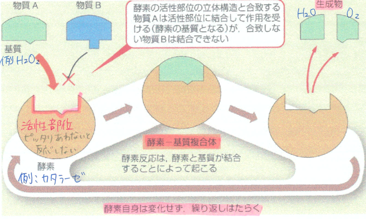 - 生成物ができると、酵素は基質から離れてもとの状態に戻る。