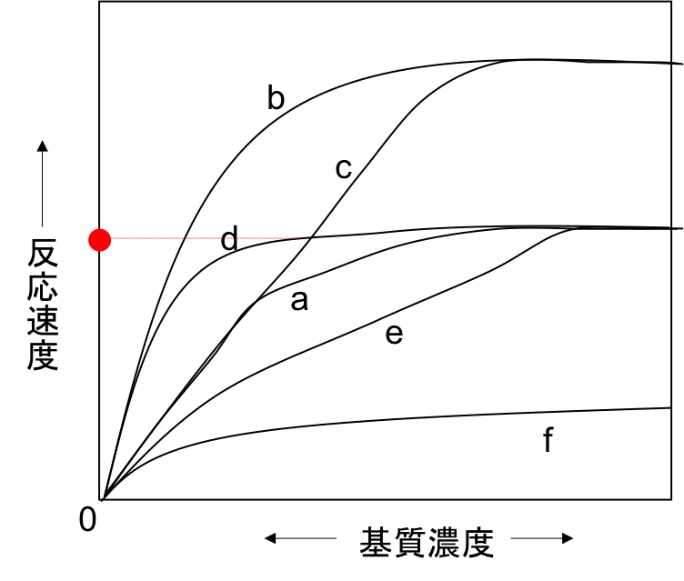 (問4)反応液に、基質と化学構造が似ており、活性部位と結合する物質を加えた場合、反応速度はb~fのどれになるか。