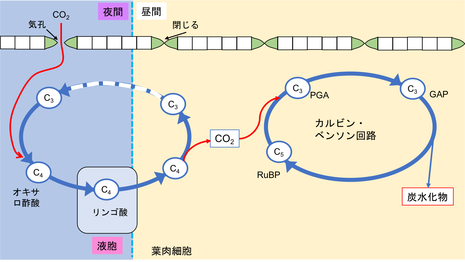 夜間は、気孔から取り込んだCO2をCAM回路でオキサロ酢酸に変え、液胞の中にリンゴ酸として蓄えておく。昼間は、蓄えたリンゴ酸を使ってカルビン・ベンソン回路を行う。