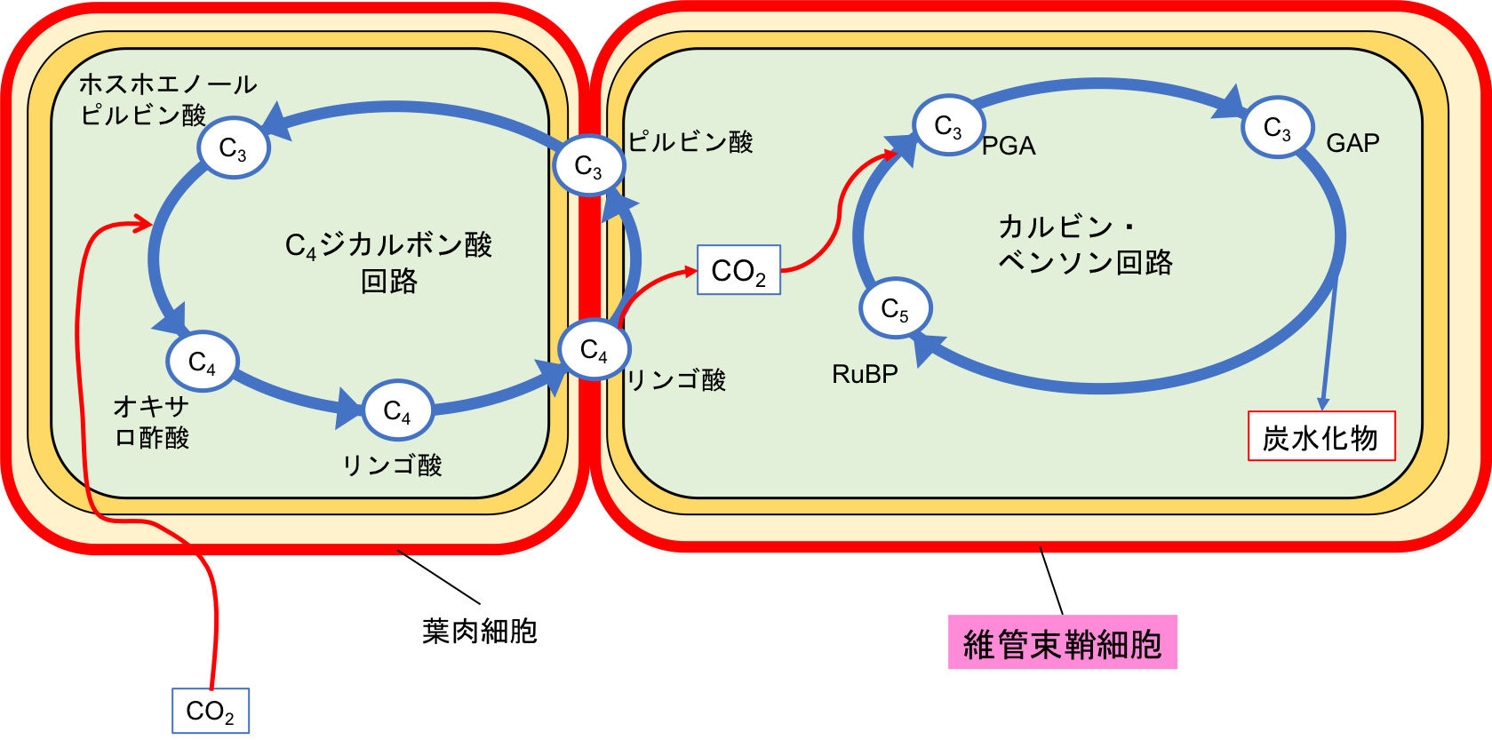 カルビン・ベンソン回路は維管束鞘細胞で行い、その前に葉肉細胞でC4ジカルボン酸回路C4回路を行う植物。