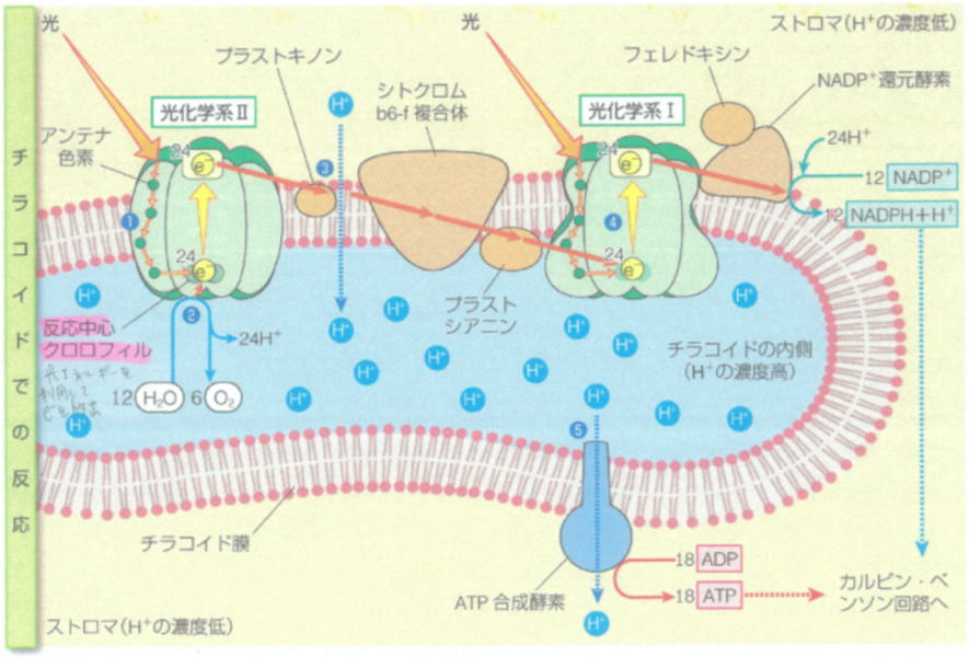 光化学反応でe–が電子伝達系を通ると生じる多量のエネルギーを利用して、H+がストロマ側からチラコイド膜内側へと能動輸送される。