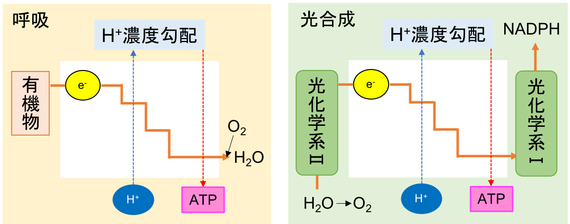 図 5 H+濃度勾配を利用したエネルギー合成の模式図(呼吸・光合成)