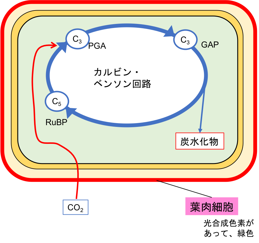 リンゴ酸は維管束鞘細胞に運ばれてCO2を放出する。これを用いて効率よくカルビン・ベンソン回路を行う。