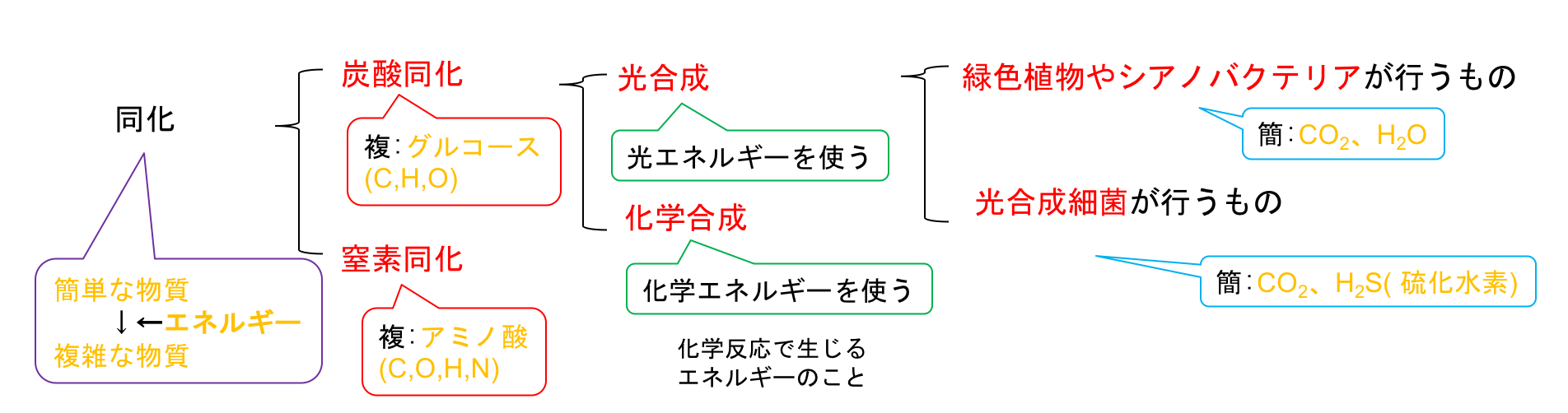 同化…生物が外界から取り入れた物質(=簡単な物質)をもとにして、エネルギーを使って生物体に必要な物質(有機物などの複雑な物質)につくり変えるはたらき。 今回は、その中でも 光合成 について解説していきます。