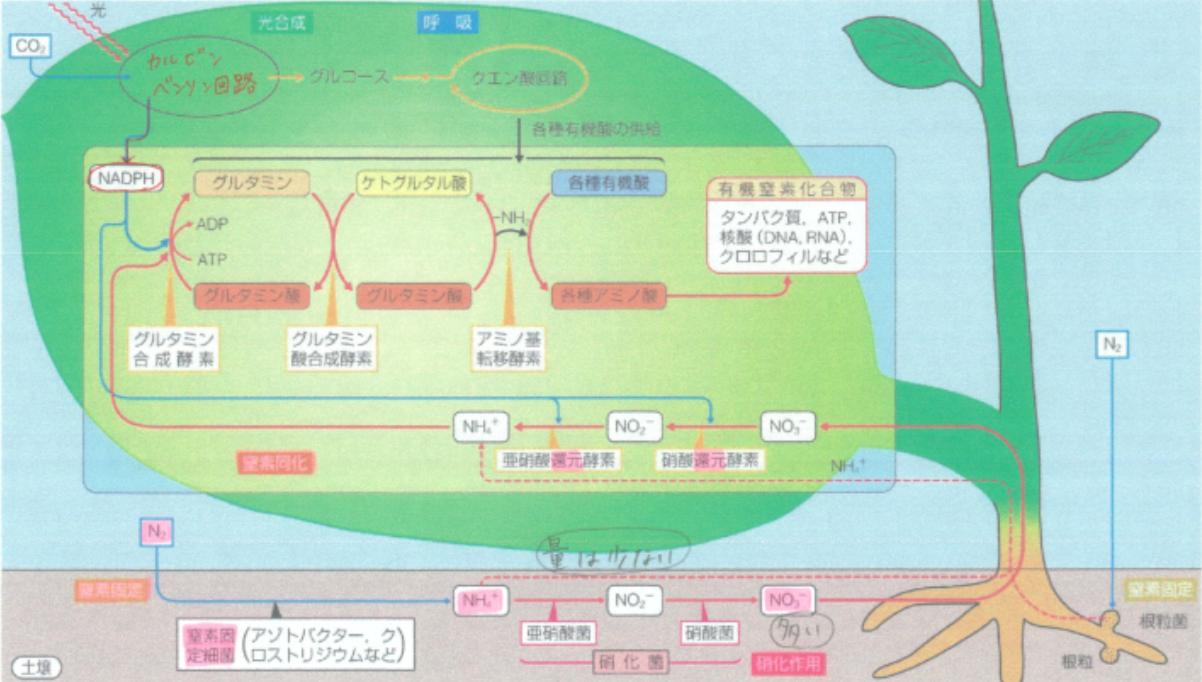 ※マメ科植物は窒素同化を盛んに行い、NH4+を有機窒素化合物に変えるため、タンパク質が多い。