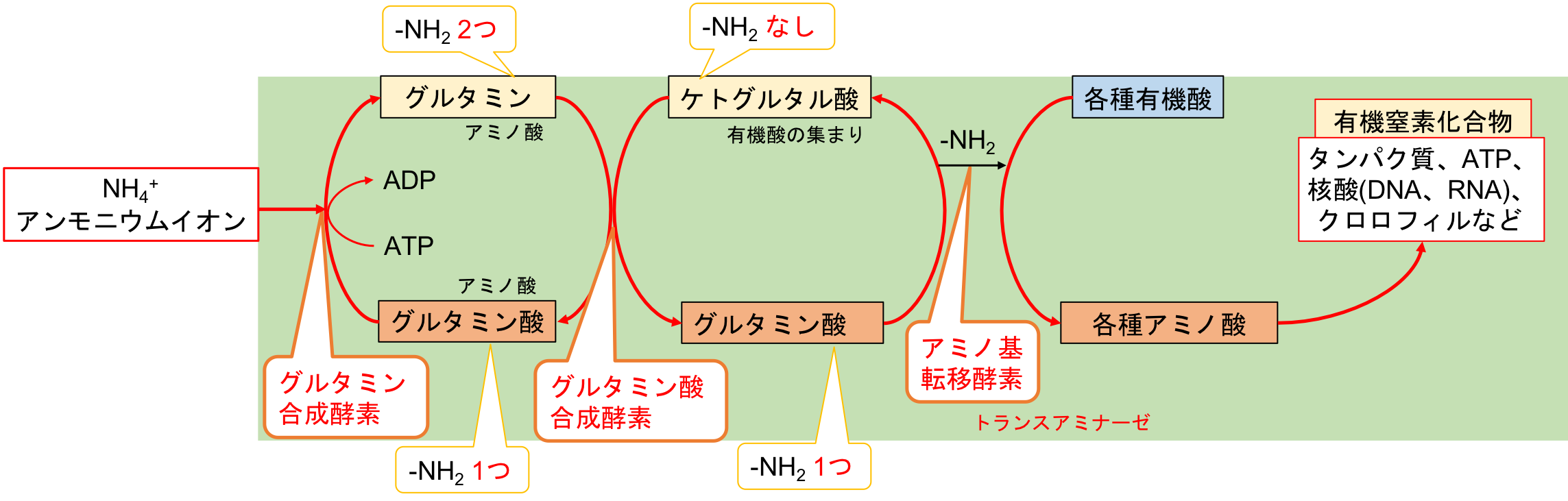 有機酸 + NH4+ → 各種アミノ酸 → 有機窒素化合物