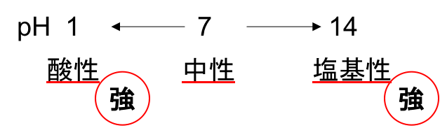 pHとはその水溶液の酸性・塩基性の強さを表す数値で、0~14の範囲で表される。(化学では酸性の対になる概念をアルカリ性=塩基性という)