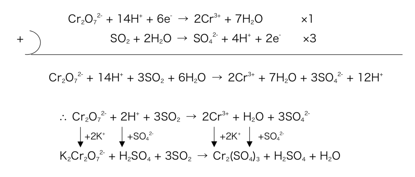 - Ex2)二クロム酸カリウムと二酸化硫黄を硫酸酸性条件下で反応させた時の化学反応式を記せ。